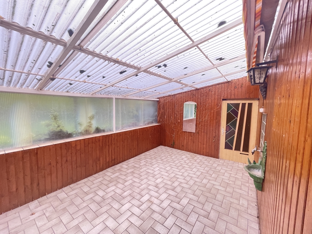 • Außenbereich: Überdachte Terrasse auf der Rückseite des Gebäudes mit Blick in den Garten