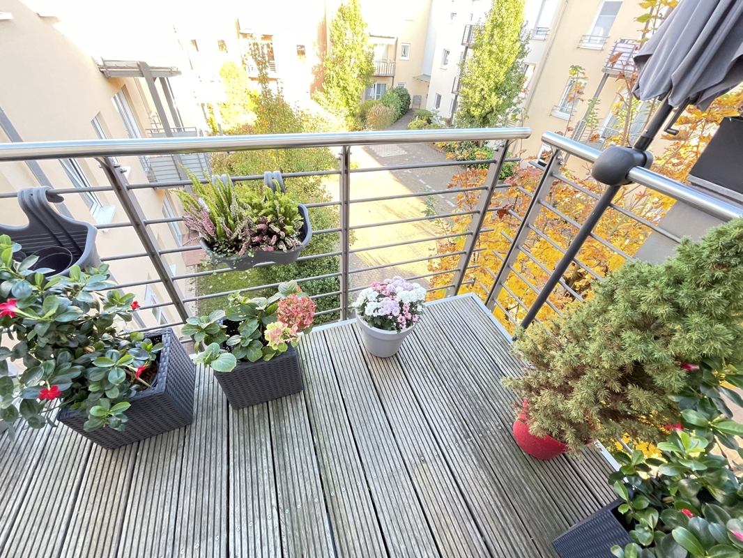 In Wohn-/ und Schlafbereich ist ein schöner Buche-Parkettboden verlegt, in Küche und Hauswirtschafsraum ein pflegeleichter, hochwertiger PVC-Bodenbelag. Das große, bodentiefe Fensterelement mit Schiebetür (wie alle Fenster: 2-fach verglast, innen Holz/außen Alu) im Wohnzimmer sorgt für einen guten Lichteinfall und verfügt über einen elektrische Rollladen. Von hier aus kann man den vorgelagerten Balkon (Stahlkonstruktion mit Bangkirai-Holzbeblankung) erreichen, auf dem eine kleine Sitzgarnitur Platz finden kann und/oder ein paar hübsche Blumenkübel.