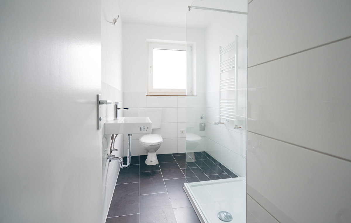 Ein gefliestes helles Bad mit Fenster ist unterschiedlich mit Wanne oder Dusche ausgestattet und wird hier mitangeboten.